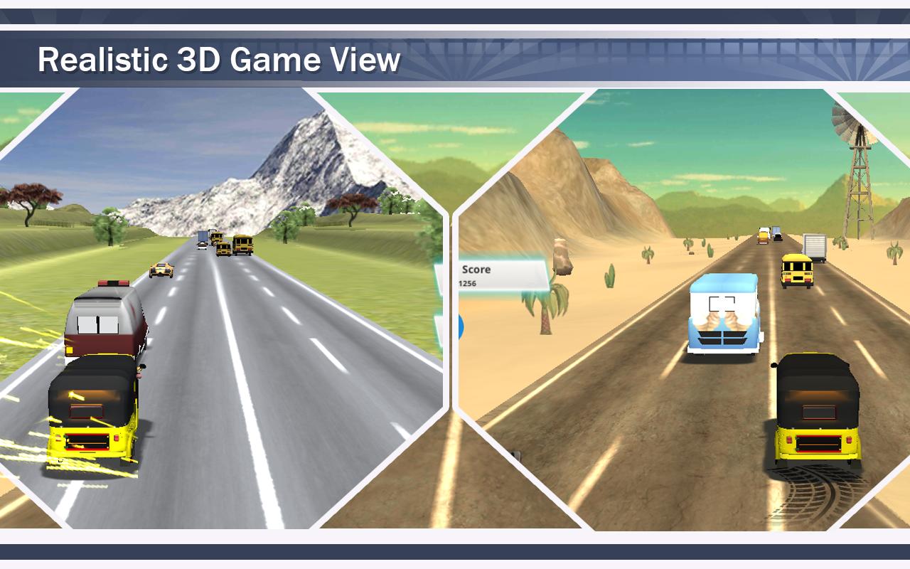 1. El juego de rickshaw de autopista proporciona un simulador 3D del tráfico de carreteras. Conduce el Auto Rickshaw en una carretera Crowdy. Pon a prueba tus habilidades de carreras de carreteras con dirección y acelerador. Manténgase alejado de los autos y camiones que vienen en su dirección. Verifique su puntaje mientras limpia los niveles en el marcador.